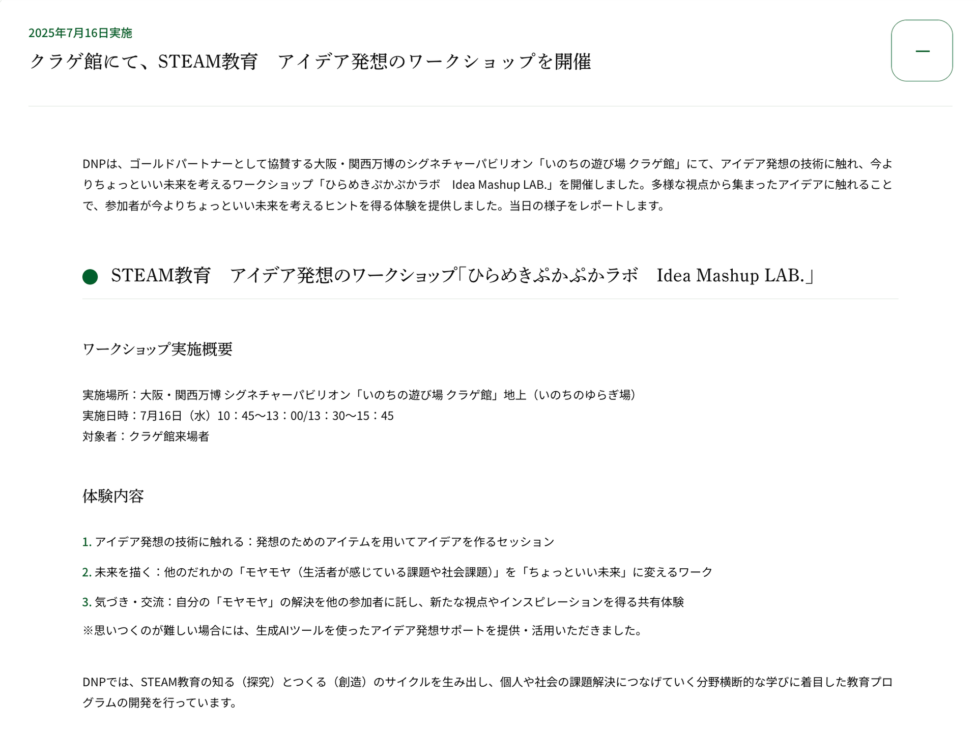 DNP様では、2025年日本国際博覧会(大阪・関西万博)のシグネチャーパビリオン「いのちの遊び場 クラゲ館」への協賛を契機に、STEAM教育の推進と未来を拓く力の育成を目指した「まなび」の創出に取り組まれています。