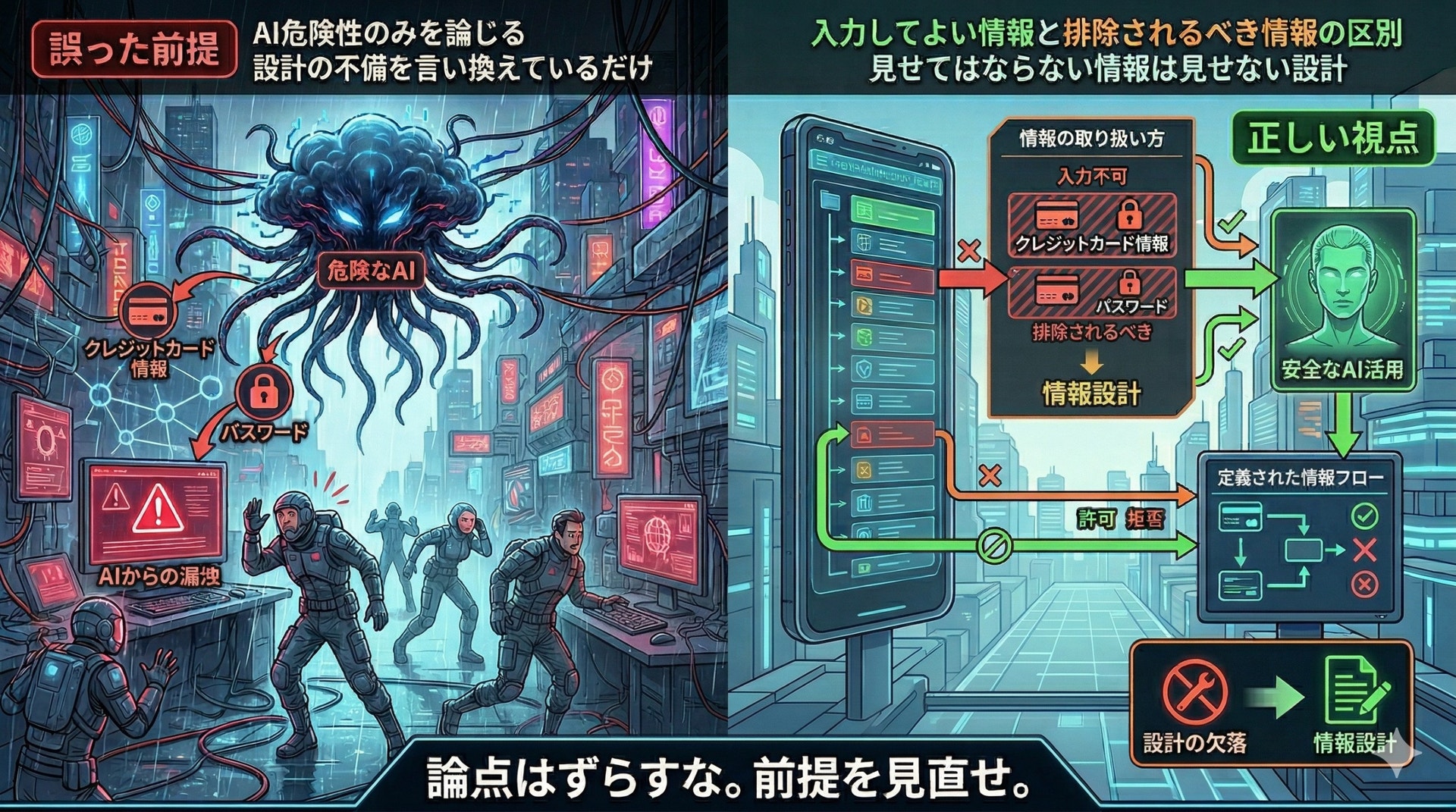 つまり、クレジットカード情報やパスワード漏洩をAIセキュリティとして語ること自体が、すでに前提を誤っています。そこで露呈しているのはAIの問題ではなく、見せてはならない情報を見せうる形で保持し、流通させ、処理しようとしている側の問題です。