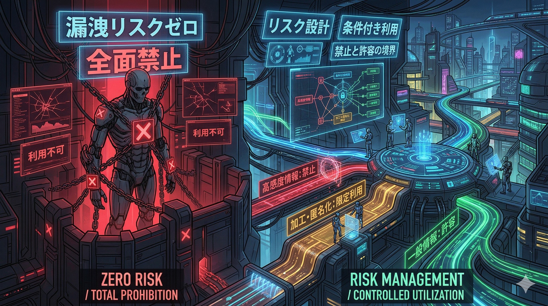 つまり、すべての情報に漏洩ゼロを求める議論は、厳格に見えて、実際には設計を放棄しています。必要なのは、禁止と許容の境界を定めることです。AIを使えるかどうかは、その境界を引けるかどうかで決まります。