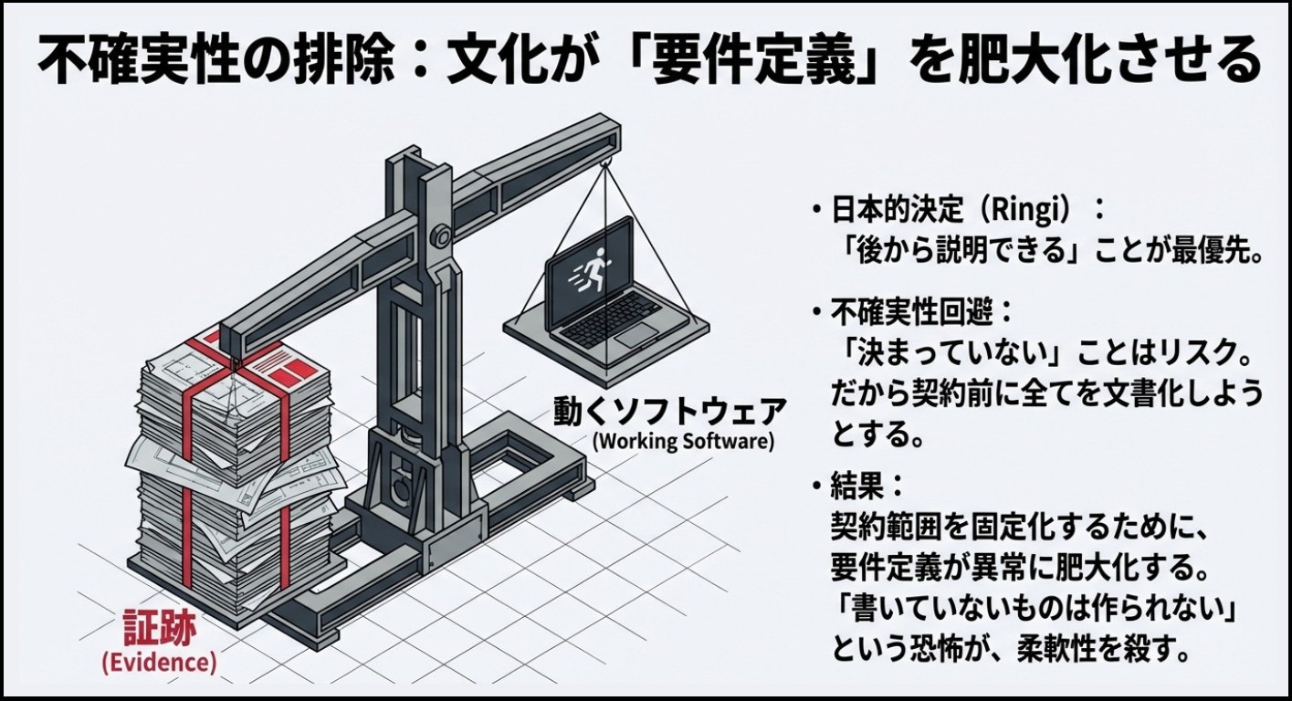 このような環境下では、物事を「確定させる」こと自体が個人の大きなリスクとなります。たとえば、業務のルールを隅々まで具体的に定めることは、担当者にとって非常に勇気が要る作業です。ルールを明確に固定するということは、将来もし想定外の深刻なトラブルが起きた際、そのルールを定めた「犯人」として自らの名前を差し出すようなものだからです。たとえ滅多に起きないような特殊なケースであっても、それが一度発生した際に致命的な損失に繋がる可能性がある限り、人は「なぜそんなルールにしたのか」と後から責められる証拠を自ら残したいとは思いません。減点方式の評価が根強い組織では、正解を出すことよりも、責任を問われないように「白黒つけないこと」の方が、身を守るための合理的な生存戦略になってしまうのです。