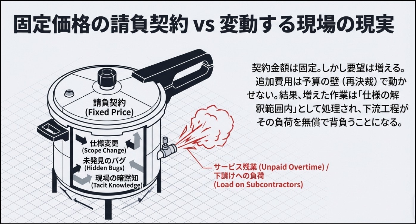 この状態で次に起きるのは、「増えた作業を追加費用として扱う」ではなく、「契約の中に押し込む」動きです。
