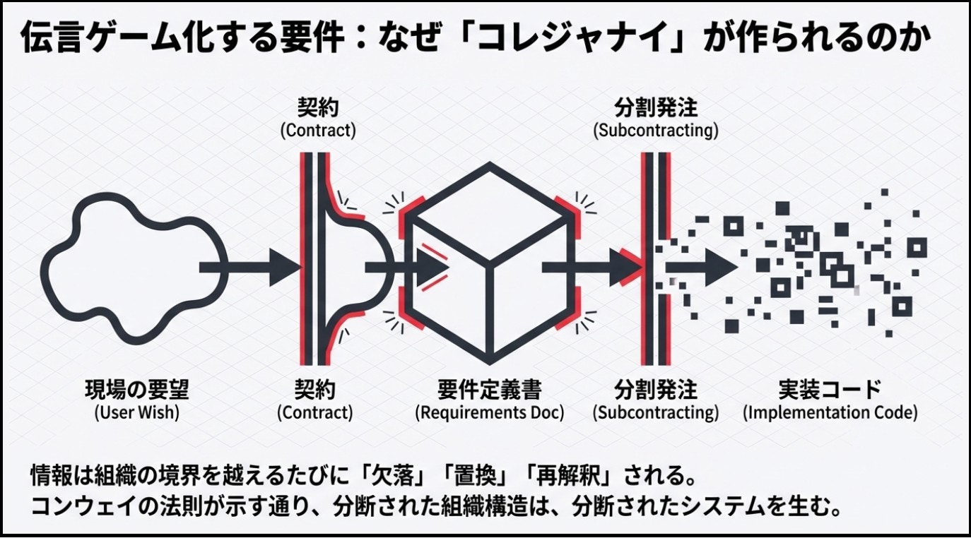 さらに深刻なのは、この変換が一度では終わらないという点です。日本のIT開発で一般的な「上流から下流へ」という流れの中では、情報は「業務の言葉」から、ステークホルダーと合意するための「管理の言葉」へ、そして「設計の言葉」を経て、最終的に「実装の言葉」へと、何段階ものフィルターを通過します。ここで重要なのは、各段階で情報を変換している担当者たちは、決して不誠実な仕事をしているわけではないという事実です。