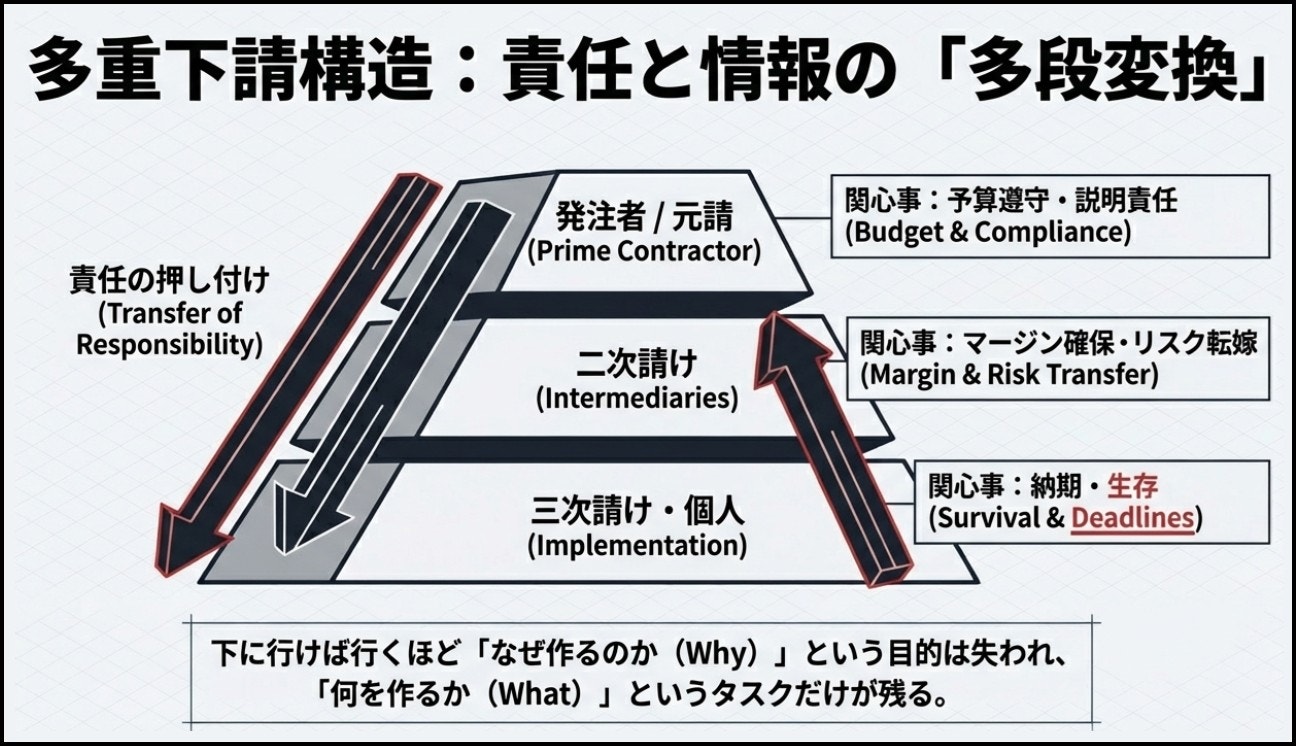そして、その増えた作業がどこに行くかというと、多重下請の連鎖のいちばん下に向かっていきます。実装と試験が下流に集まっている以上、増分も下流に落ちる。ここまでは単純です。問題は、本来なら下流が「増えた分は追加工数だ」と言って上流に請求すべきなのに、それが簡単に通せない力が働くことです。