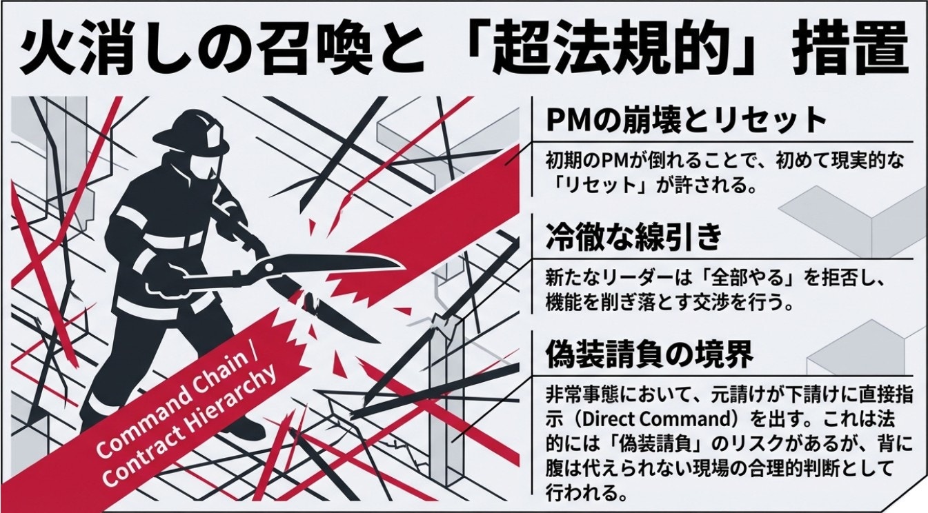 これはプロジェクトにとって最大の悲劇であるはずですが、実態としては「強制リセット」としての機能を果たします 。中心人物がいなくなったことで、元請けの経営層やユーザーもようやく現実を認めざるを得なくなります。特にユーザーが危機感を持つことで、状況は大幅に変わります。