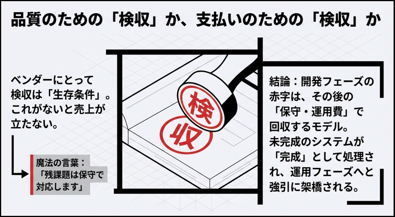 これは決して不誠実だからではありません。請負契約において、検収は単なる儀式ではなく、報酬請求権を確定させる決定的な関門だからです。どれだけ開発に人と時間を投じても、顧客の検収印がなければ売上は立たないのです。資金繰りの観点から見れば、検収は品質指標ではなく、企業のキャッシュフローを左右する生存条件そのものです。だからこそ、現場がどれほど疲弊していようと、ベンダーは最後に必ずこの一点へと照準を合わせてきます。