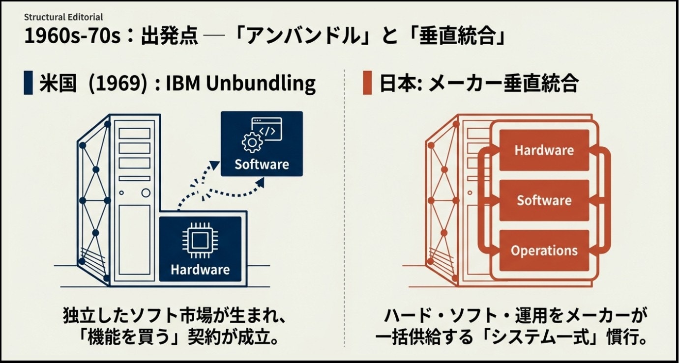 1969年、IBMはハードとソフト/サービスの「別価格」(アンバンドル)を打ち出し、ソフトウェアを独立した商品として扱う市場形成へつながった。