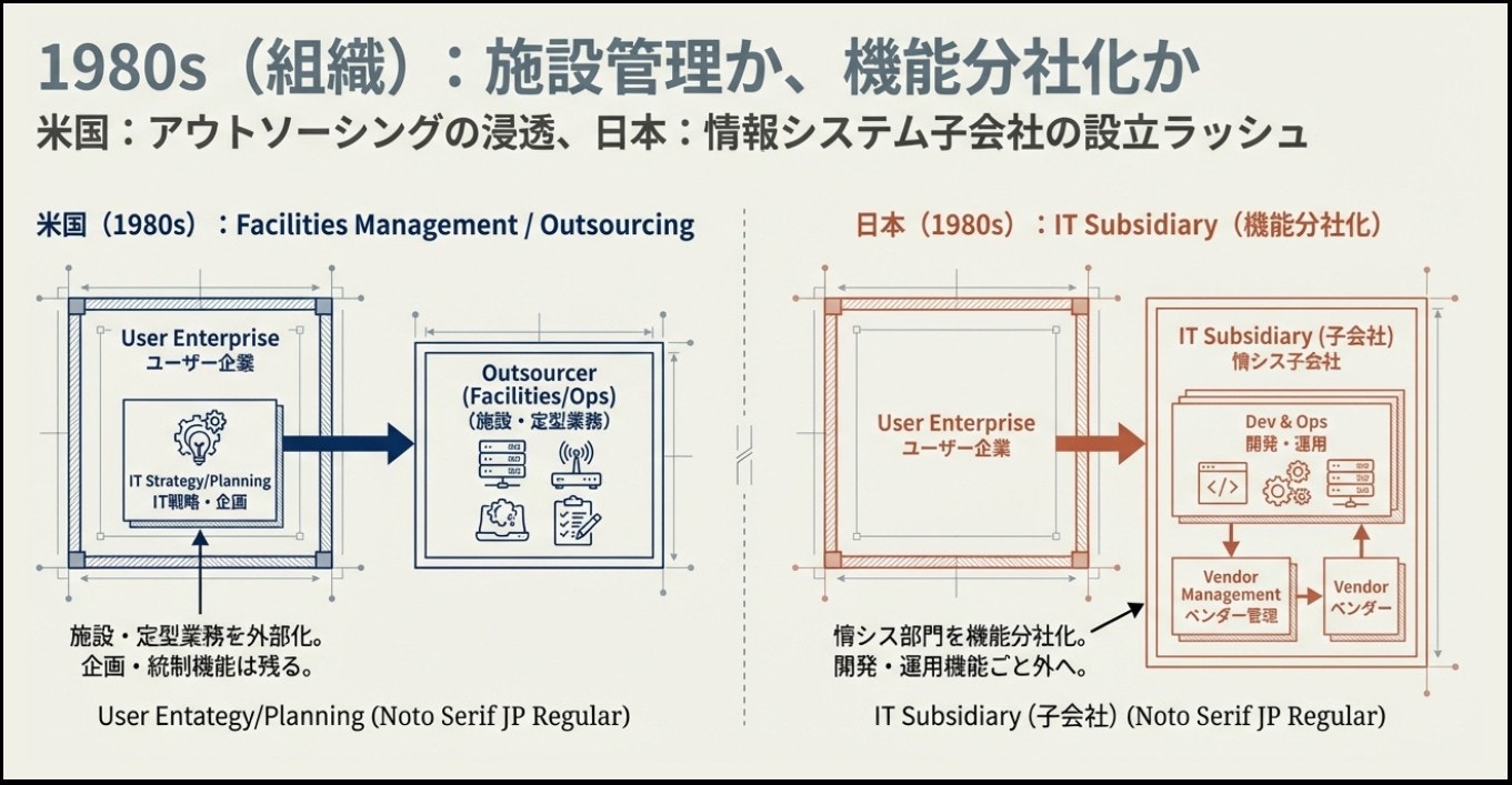 アウトソーシングが運用・データセンター運営を中心に大型化していき、1989年にはKodakがIBMに新データセンターの設計・運営を委ねたと報じられた。外部化されたのは主に運用領域で、統合や意思決定は発注側に残りやすかった。