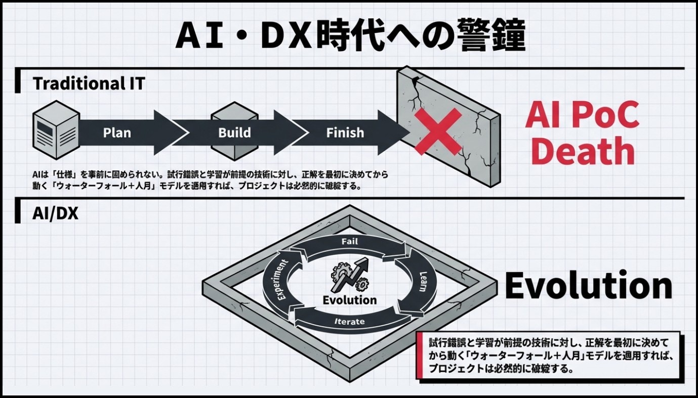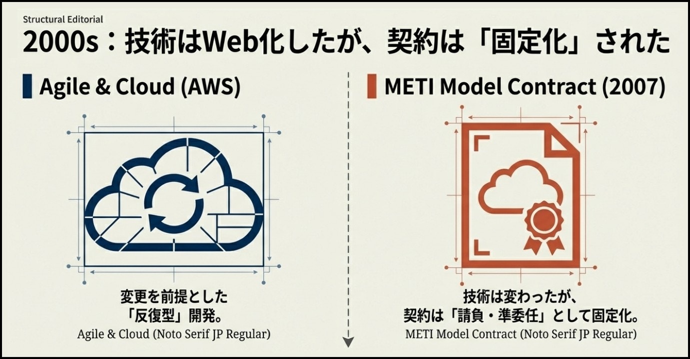 その結果、クラウドやアジャイルといった新しい技術や開発手法が登場しても、開発の進め方や役割分担の基本構造は大きく転換せず、継続的な改善を前提とした運用モデルへ移行しにくい状況が続いた。