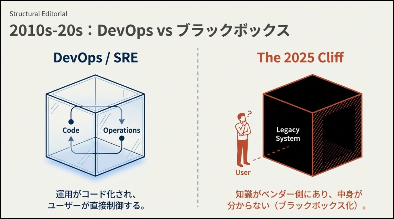 後年のDXレポートも、こうしたスクラッチ偏重や過度なカスタマイズがブラックボックス化を招いたと指摘しており、その土台は1990年代以前から形成されていたと考えられる。
