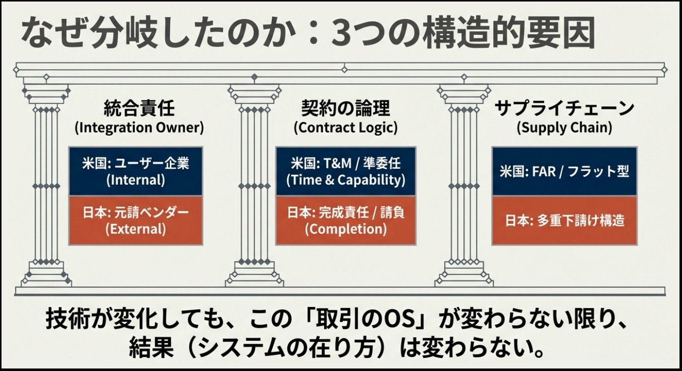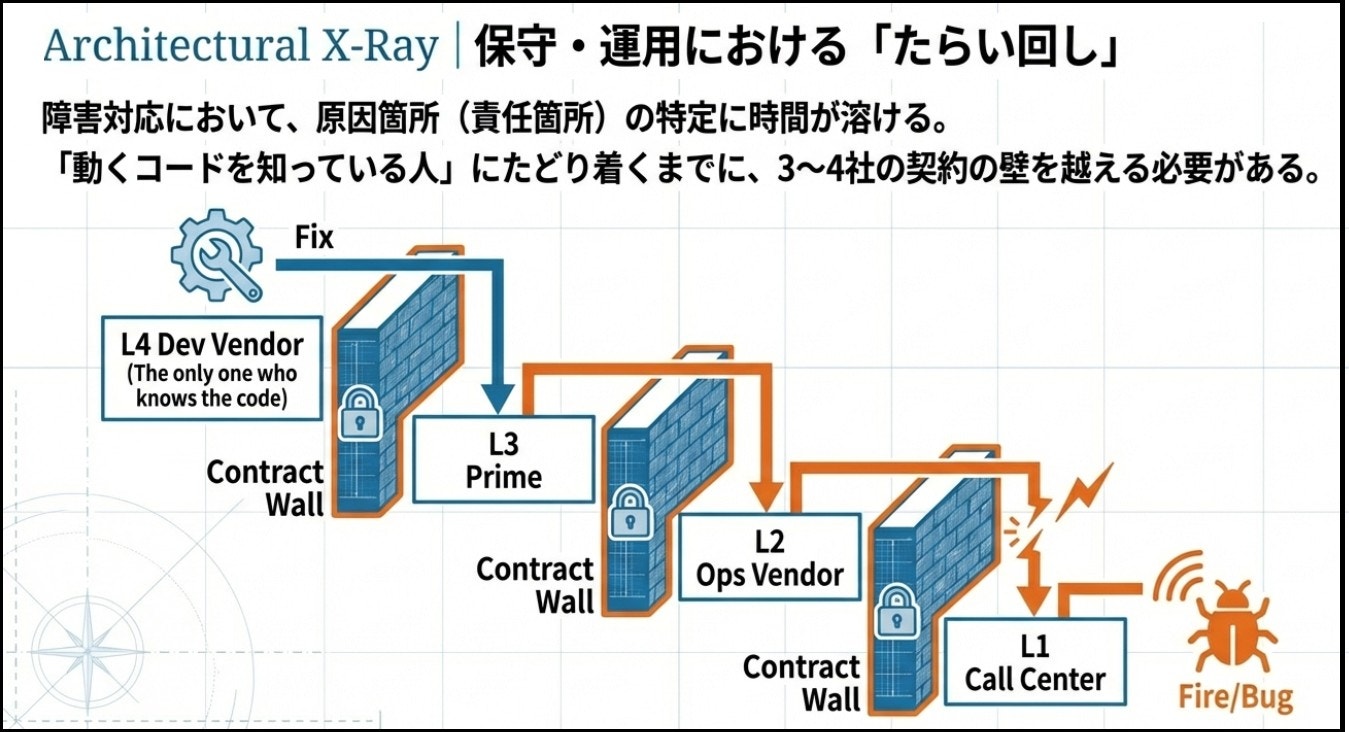 その結果、日本のIT体制では元請SIの下に実装工程を配分する多層分業が定着し、多重下請けが標準的な開発体制として固定化していった。