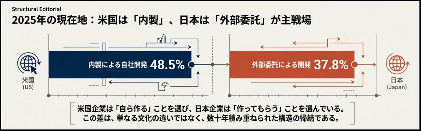 IPA「DX動向2025」は日米独比較において、重要なシステムの開発体制を見ると、日本は外部委託の比率が最も高く、米国は内製の比率が最も高いという対照的な構図を定量的に示している。