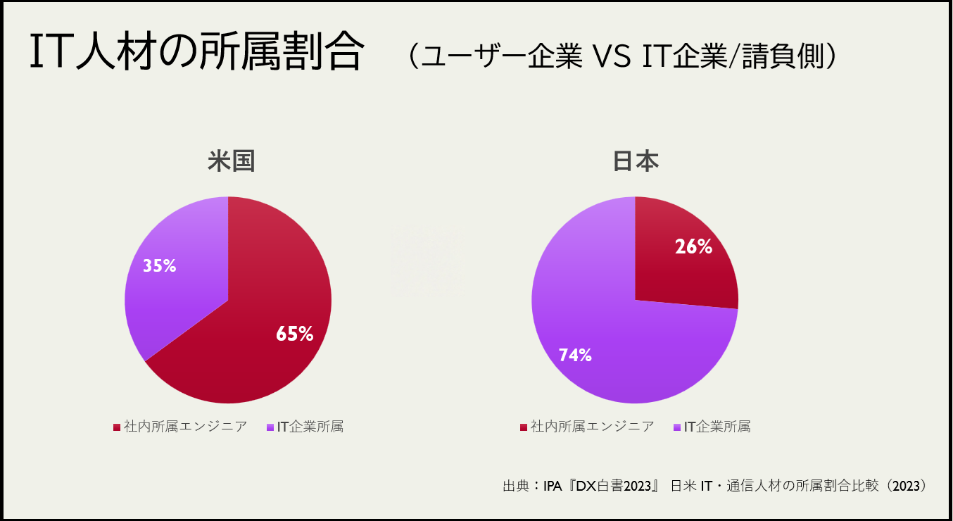 日本ではITエンジニアの多くがベンダー企業側に偏在し、システム開発を外部委託する構造が定着してきた。このため、ユーザ企業側に運用・改善の知見が蓄積しにくく、要件確定型の開発やベンダー依存の体制が維持されやすいと整理されている。