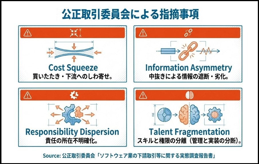 2022年、公正取引委員会はソフトウェア業の取引実態を調査し、これを「多重下請構造型サプライチェーン」と整理した。報告では、元請・中間下請・最終下請といった層構造の定義に加え、実質的な付加価値を持たない仲介的事業者の類型も示され、取引の多層構造が産業上の課題として公的に可視化された。
