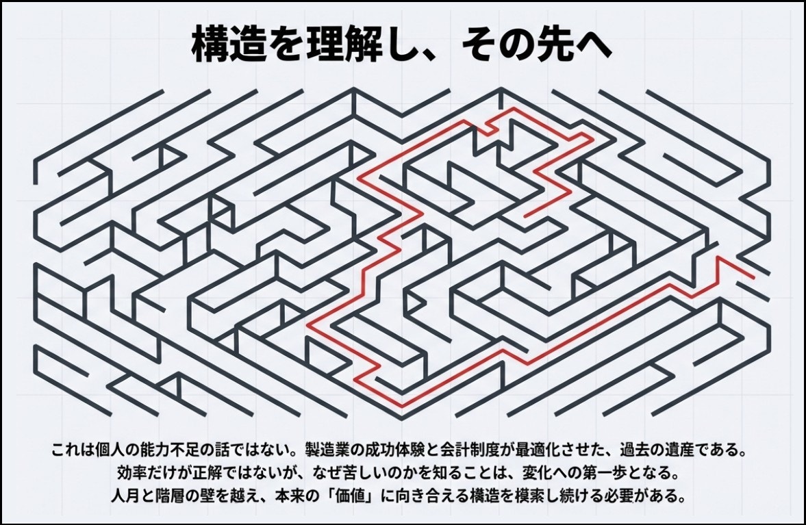 どちらの経路を通っても、帰結は同じです。改善によって生まれた余力は、利益や裁量として残らず、次回の前提工数を削る根拠として回収されます。現場から見れば、速く終わらせるほど次の条件が厳しくなる構造です。