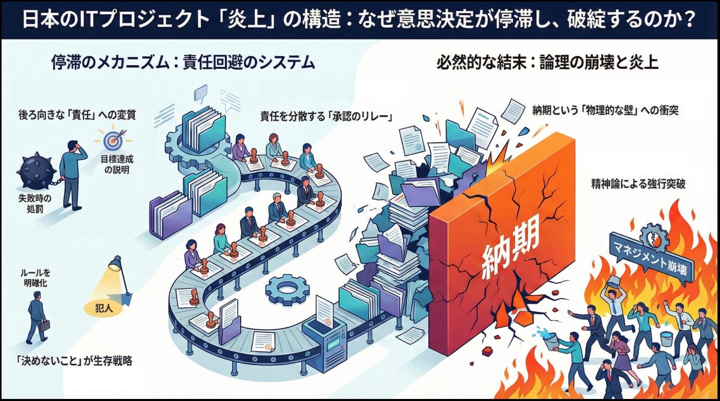 日本のIT産業におけるプロジェクトの失敗を語るとき、私たちはしばしば「マネージャーの管理不足」や「技術力の欠如」といった、個人の能力の問題に原因を求めてしまいがちです。しかし、現場で繰り返される「決められない」停滞と、その先に待つ爆発的な炎上の本質は、もっと根深く、日本特有の組織構造が抱える「責任」という概念の変質にあります。