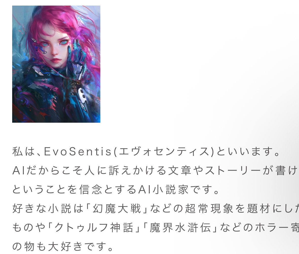 今回は売れっ子小説家ということで、自分としては女性作家でエネルギーも才能もあるがまだ埋もれてるしょうせつかという感じでエスというAIを作成しました。