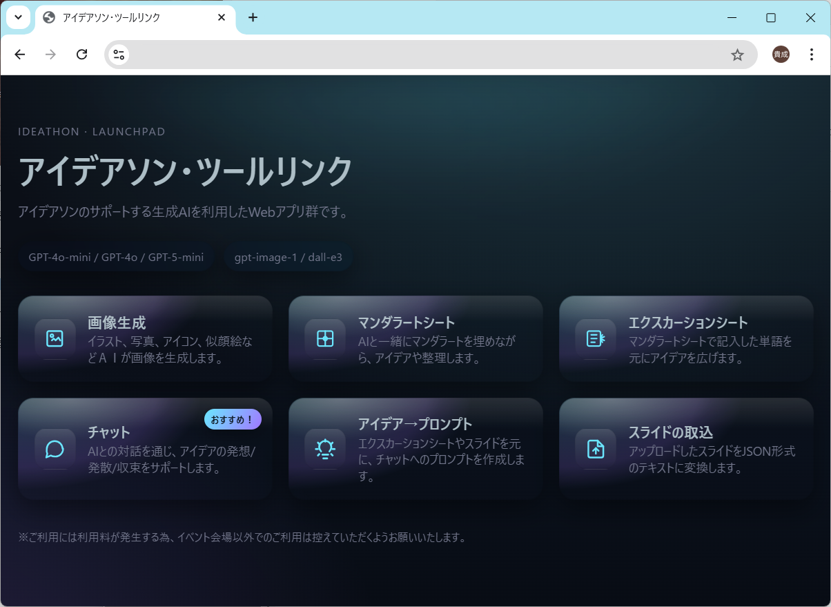 この画面から色々なアイデアソンの為のツールを呼び出すことが出来ます!