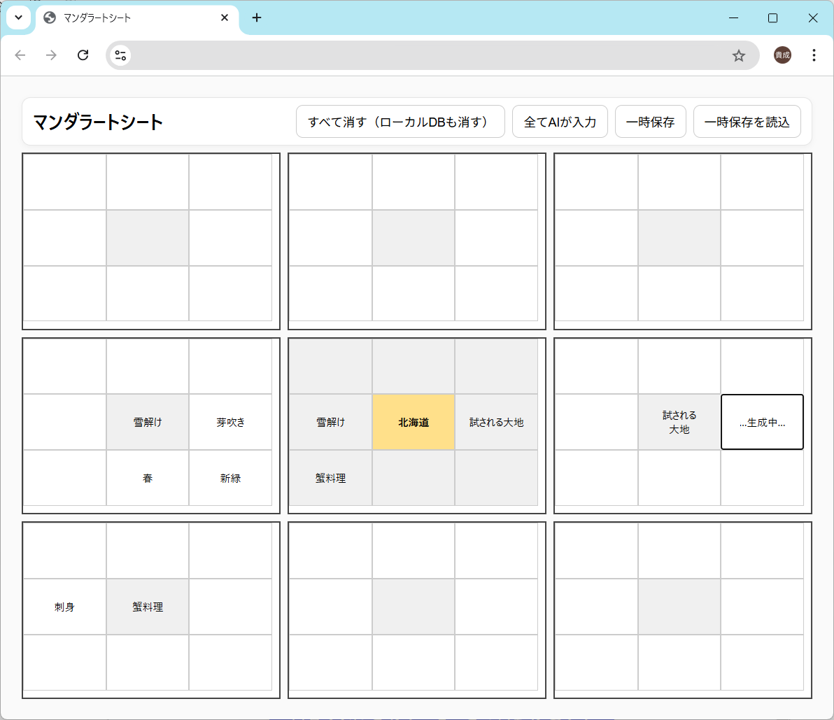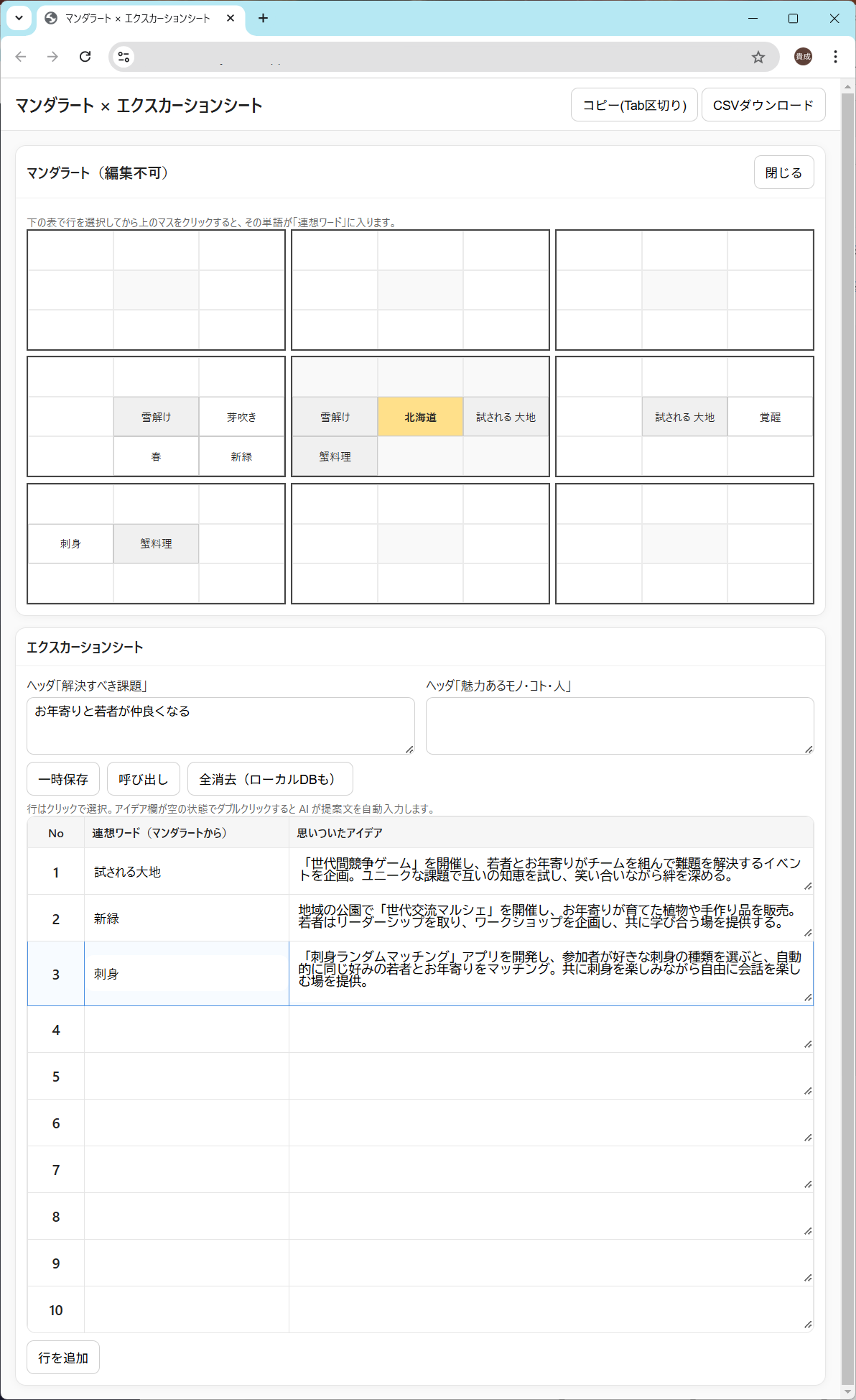 AIも利用可能で、まずマンダラートから単語を選び、「アイデアを何も書いていない状態」でダブルクリックすると…AIが代わりにアイデアを考えてくれます。AIが考えたアイデアは、すぐにでも実行できそうな優等生的なアイデアを即座に出してくれます!