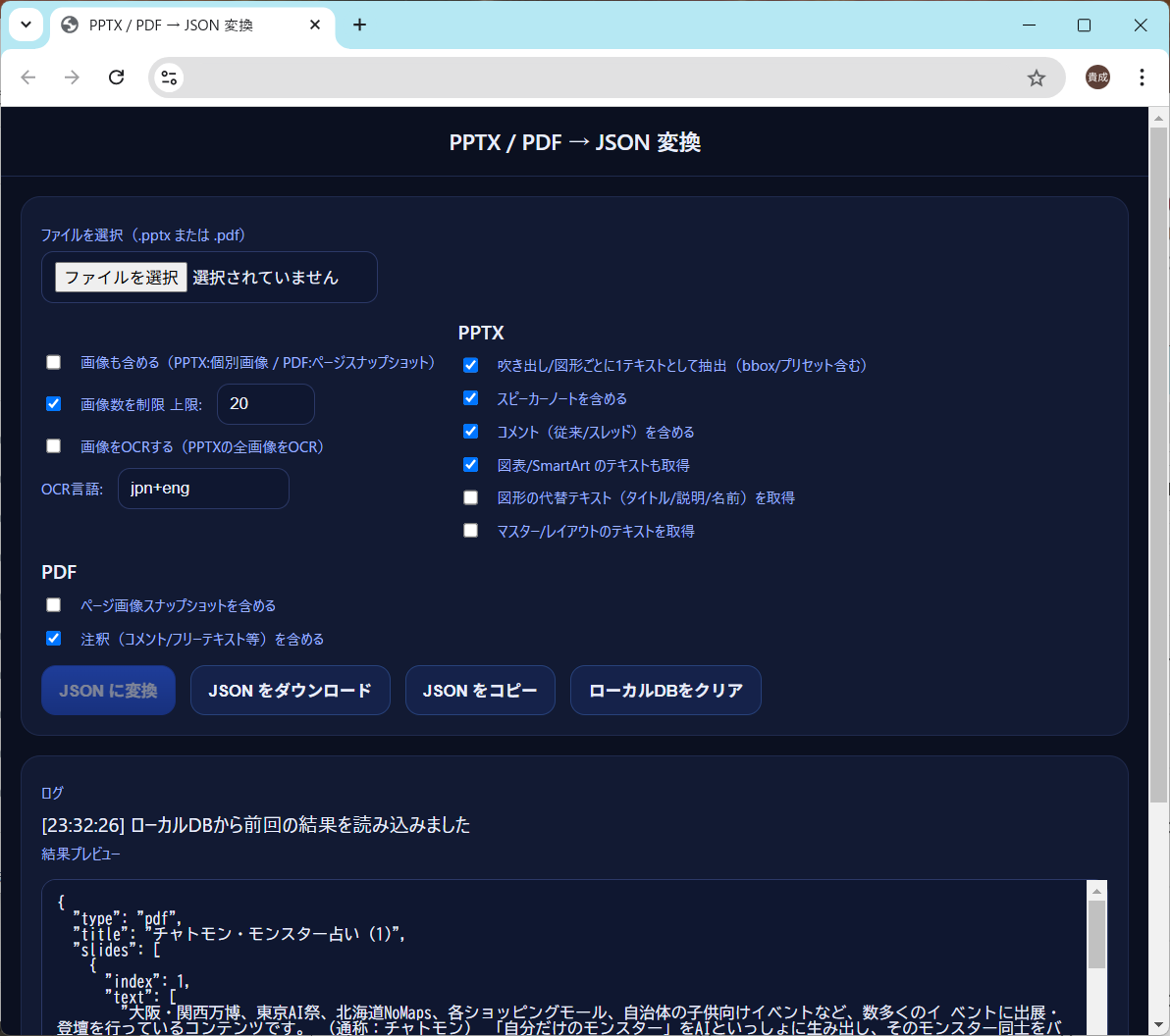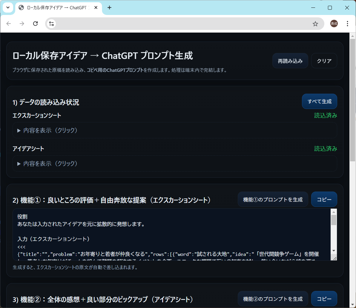 エクスカーションシートやスライドの内容は全てローカルのブラウザ内に保存されています。それらのテキストを加工して、チャット貼付用のプロンプトを自動作成しよう!という画面です。