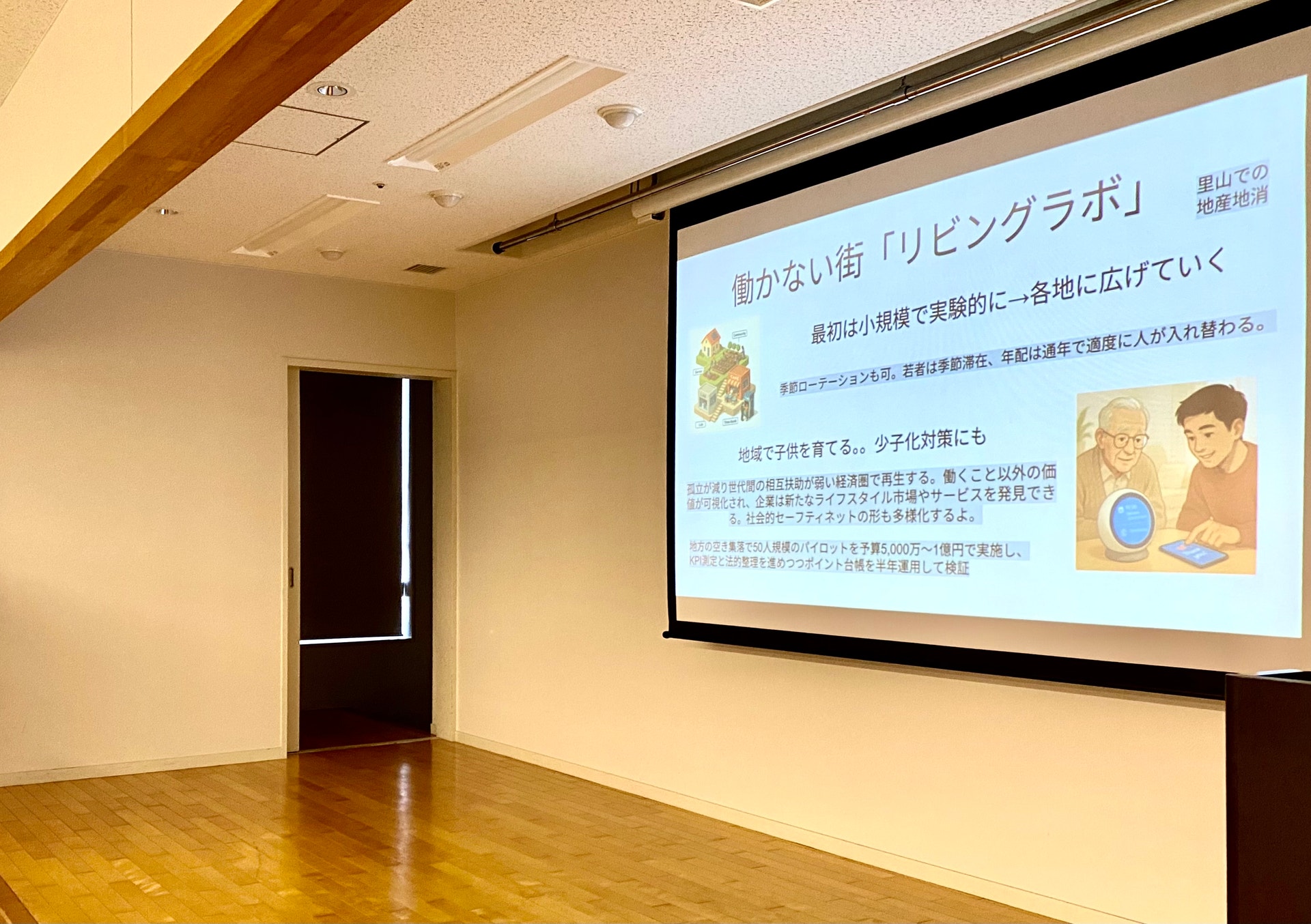 ライフワークバランスを重視して働くことに意味を見出していない若者が多い。そういった働きたくない若者と年金暮らしのお年寄りをお金が不要な町として一緒に住み事により交流を深める…という内容。かつての村社会、長屋などの考え方。AI時代、能力の格差が大きくなるため、働かない人を作る方が全体として効率よく社会が回るのでは?という発案でした。