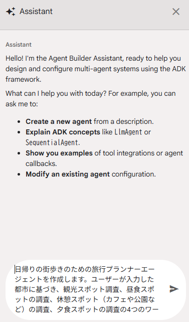 画面右側にはアシスタントがいます。ここでGeminiとチャットしてAIエージェントシステムを構成することが出来るようになっています。最初から手作業でフローを構築するのは大変なので、Geminiにやってもらうほうが良いです。