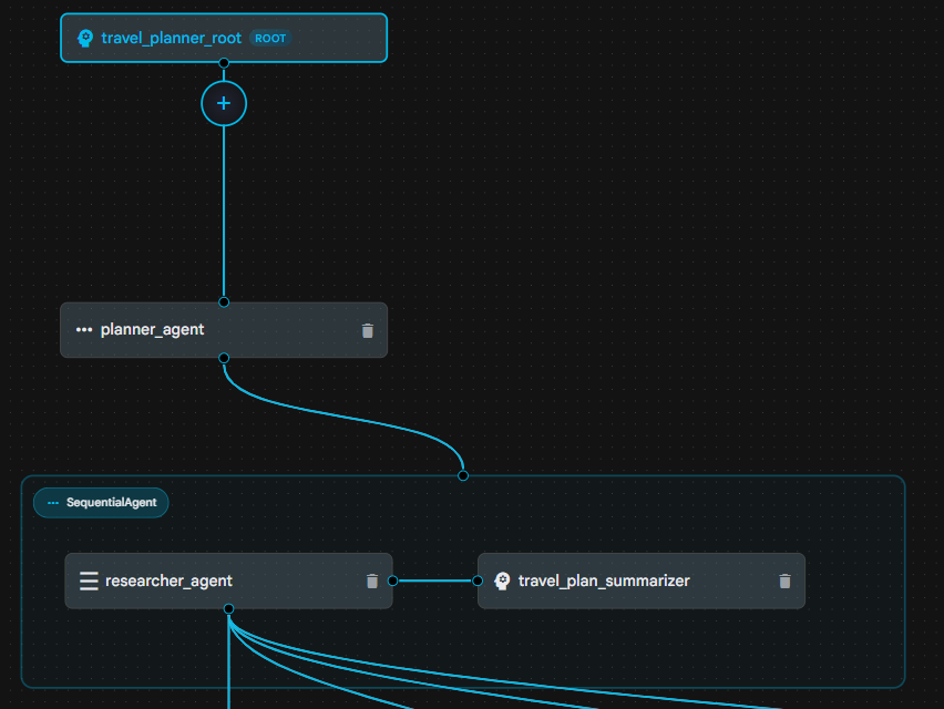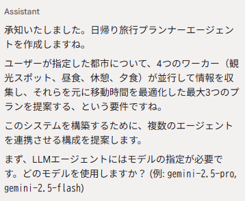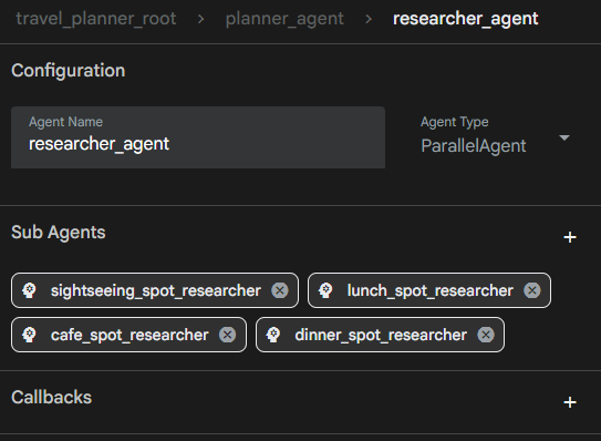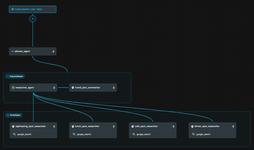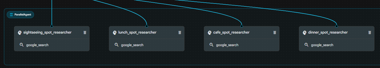 日帰りの街歩きのための旅行プランナーエージェントを作成します。ユーザーが入力した都市に基づき、観光スポット調査、昼食スポットの調査、休憩スポット(カフェや公園など)の調査、夕食スポットの調査の4つのワーカーを並行して実行します(必要に応じてGoogle検索を使用)。