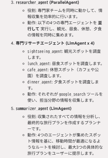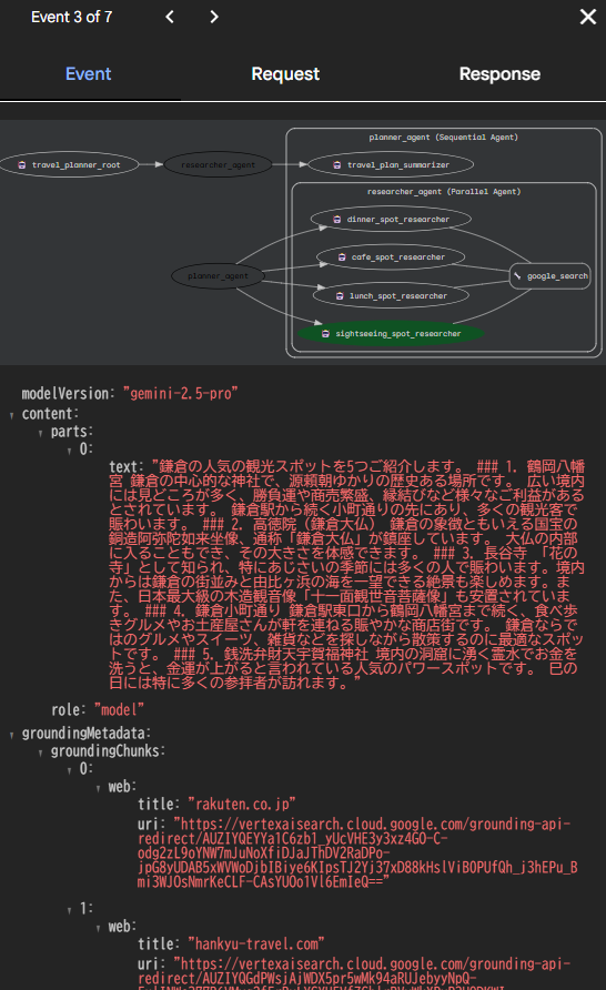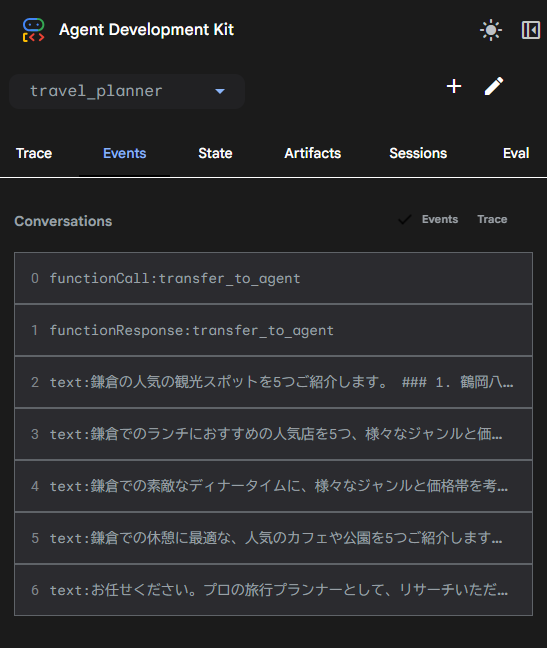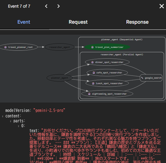 長くなるので省略しますが、最後のtravel_plan_summarizerエージェントには、各調査エージェントの調査結果が入力に追加されて動いている様子が確認できます。