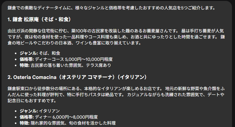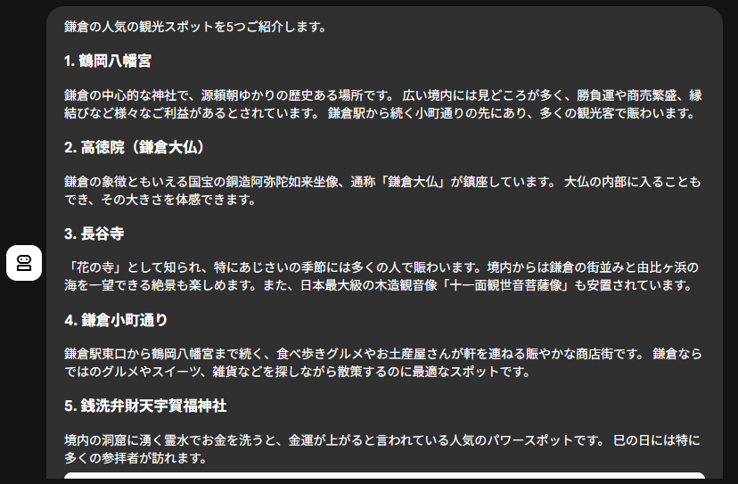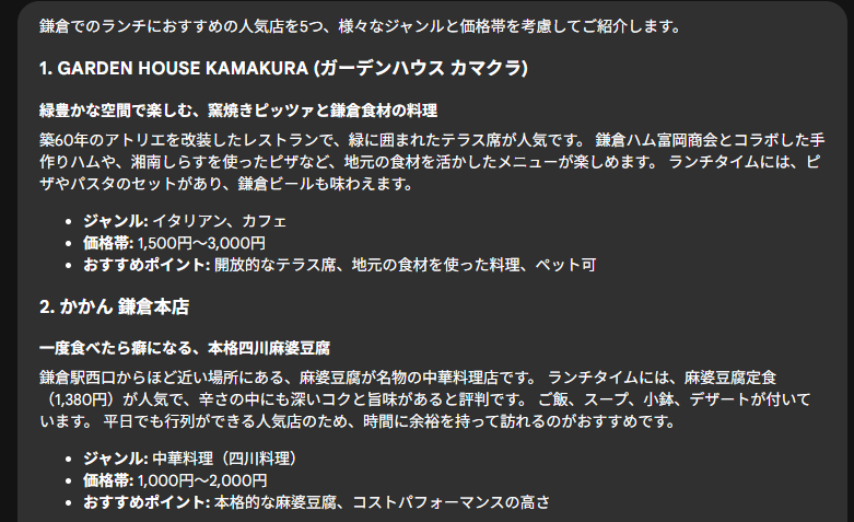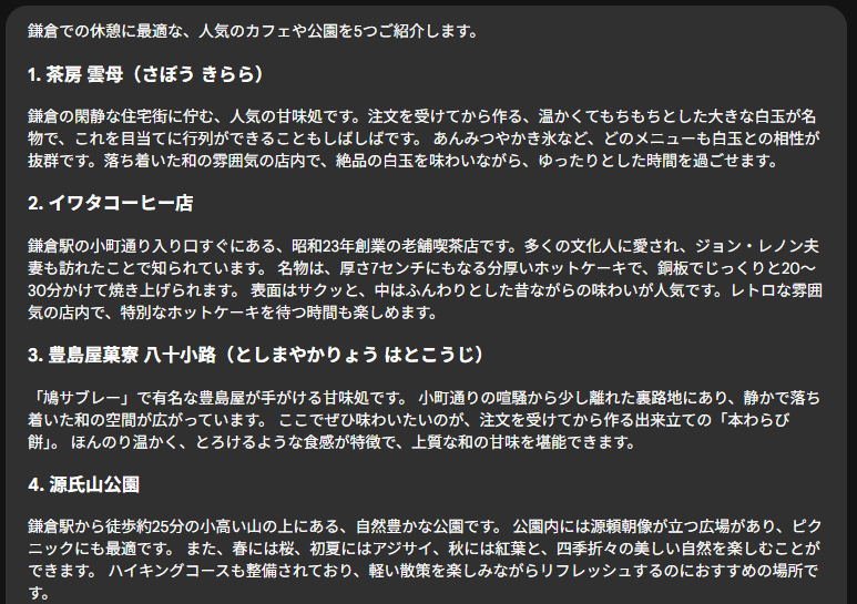 まず最初に結果が返ってきたのが観光スポット調査エージェントでした。定番どころは押さえてますね。