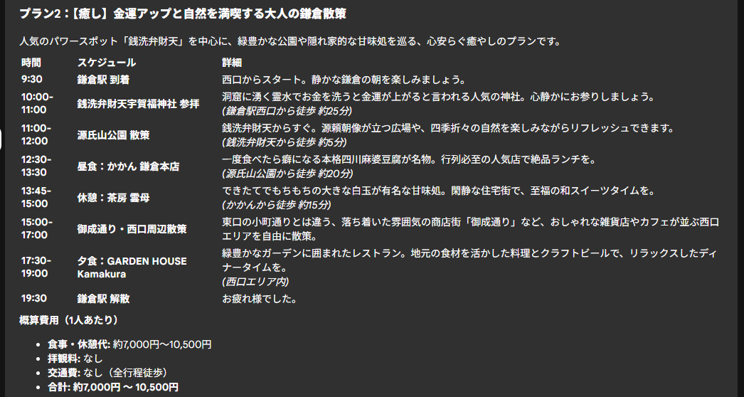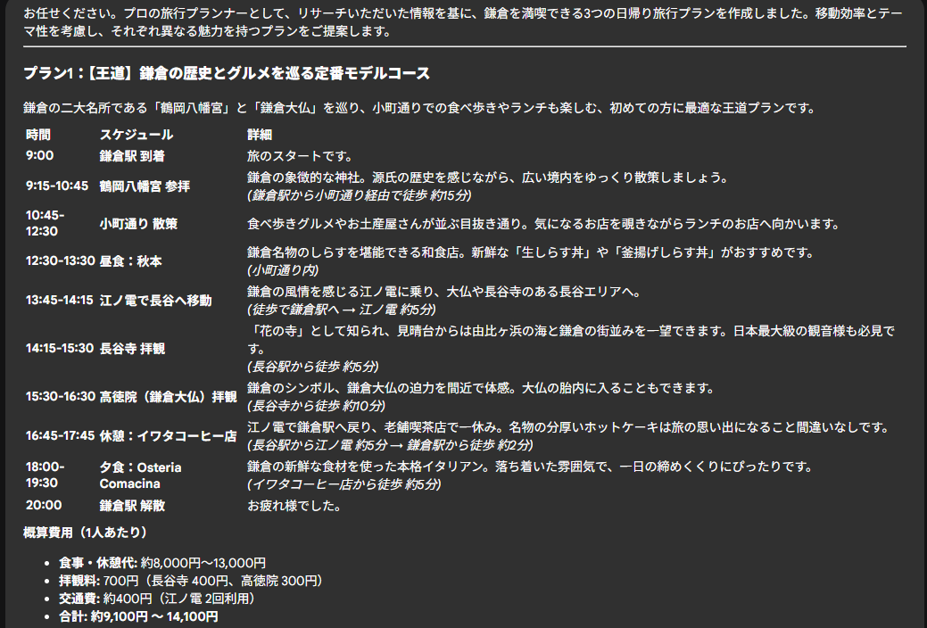 これらの結果を総合して旅行プランナーエージェントがプランを作成してくれます。
