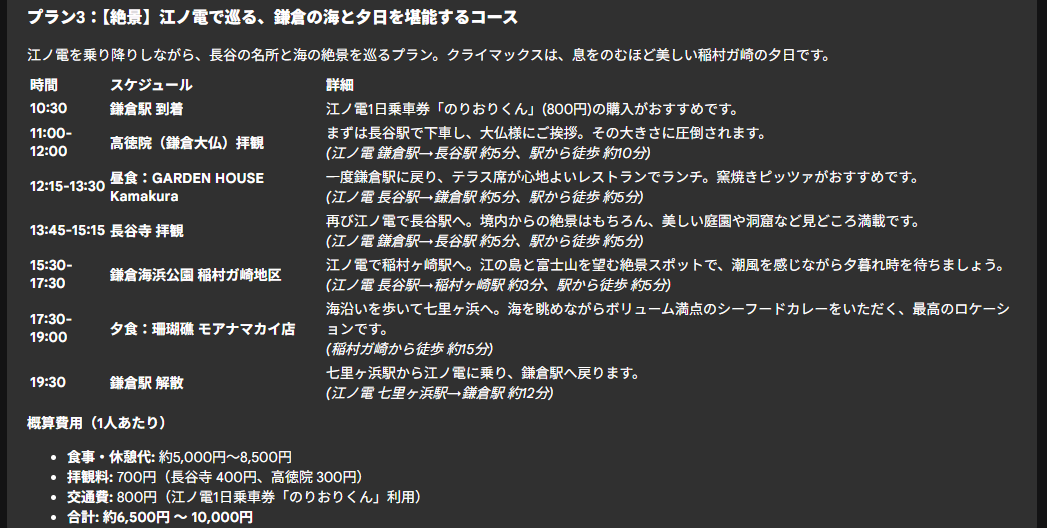これらのワーカーが調査した情報を収集し、移動時間が少なくなる経路を検討しユーザーに提示します。最大3つのプランを提示します。概算の移動時間と費用、およびスポットについての簡単な情報を提示します。