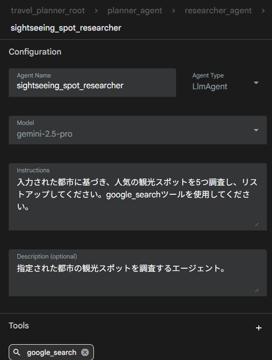 各調査エージェントはLlmAgentなのでGeminiを使います。ツールとしてgoogle_searchを使っています。このようにLLM単体ではできない作業はツールを呼び出して行わせることが出来ます。
