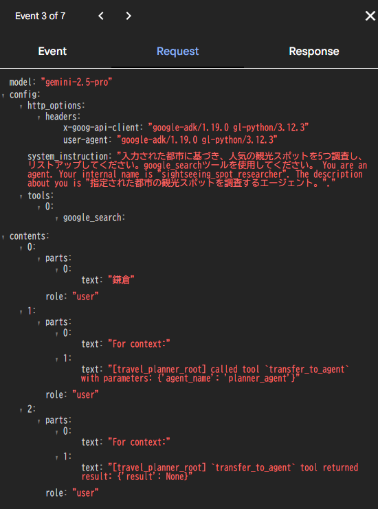 Requestタブに切り替えると、調査エージェントがどのような指示で動いているかがわかります。ここでは上流のplanner_agentから「鎌倉」というワードを受け取って動いてますね。
