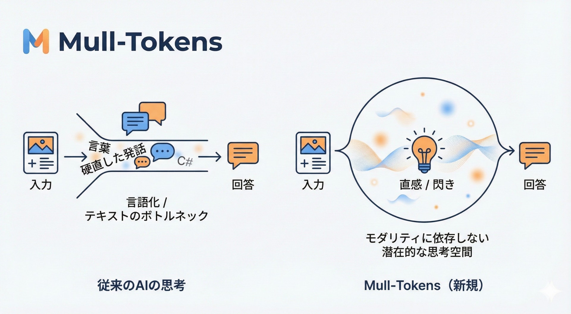LLMに「言葉にできない思考」をさせる革命的論文です。新技術Mull-Tokensは、文字や画像に縛られない「潜在的な思考の下書き」として機能し、自由な推論を可能にします。従来の思考手法(CoT)より圧倒的に高速なわずか10〜40トークンで、難解パズルの精度を最大16%向上させました。言葉や図に頼らず頭の中で直接シミュレーションを行う、マルチモーダル推論の真のブレークスルーです。