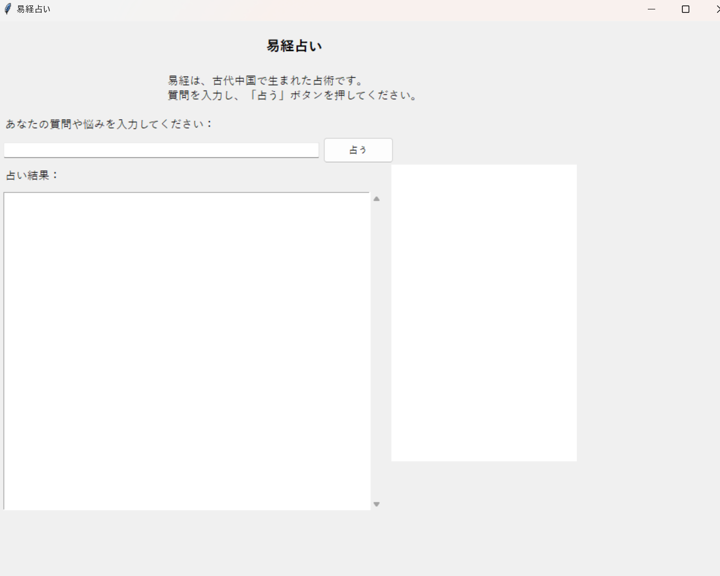 コインや竹棒などを用いてランダムに卦を生成し、その卦を易経の解釈に基づいて読み解きます。結果は、現在の状況や未来の可能性を示唆するものとされています。