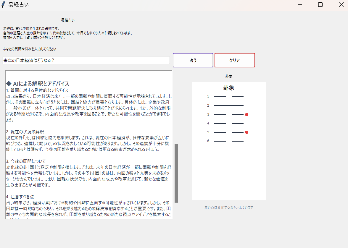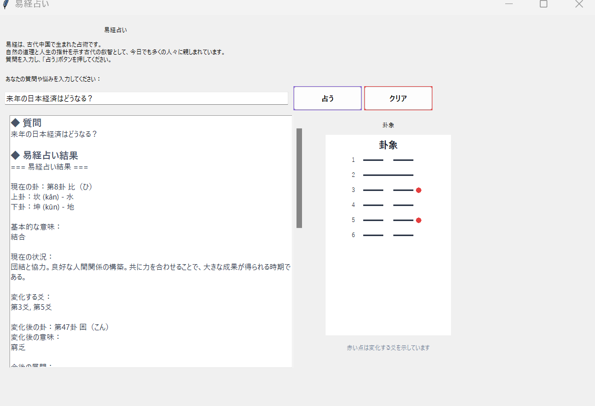 さらに、易経占いは単なる運勢の占いに留まらず、人生の指針や行動のヒントを得るための深い洞察を提供します。その奥深さに惹かれ、今回のプロジェクトで採用しました。