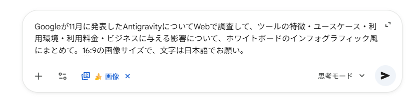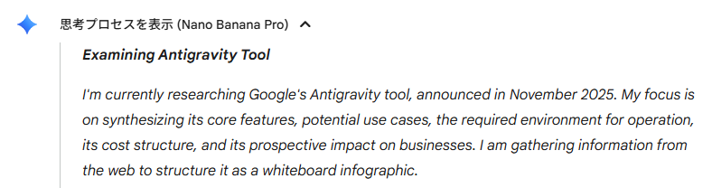 Nano Banana Proは画像生成する前に「思考」を行っています。Webで調査してとお願いしておくと情報を集めてから画像を生成してくれますので最新情報にも対応できます。試しに最近出たばかりのGoogle Antigravityについてまとめてもらいます。