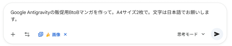 現在、GoogleのAntigravity技術をプロモーションするためのB2Bマンガの制作に注力しています。開発リーダーとCTOをターゲットとしています。目標はA4サイズ2ページで、問題解決とビジネスインパクトに焦点を当てることです。1ページ目では課題を提示し、2ページ目では魅力的なソリューションを描きます。