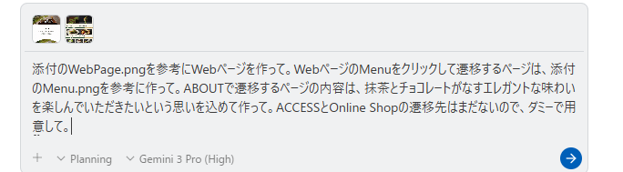 イメージが用意できたので、ここでGoogle Antigravityを使って実際のWebページを作ってもらうことにします。