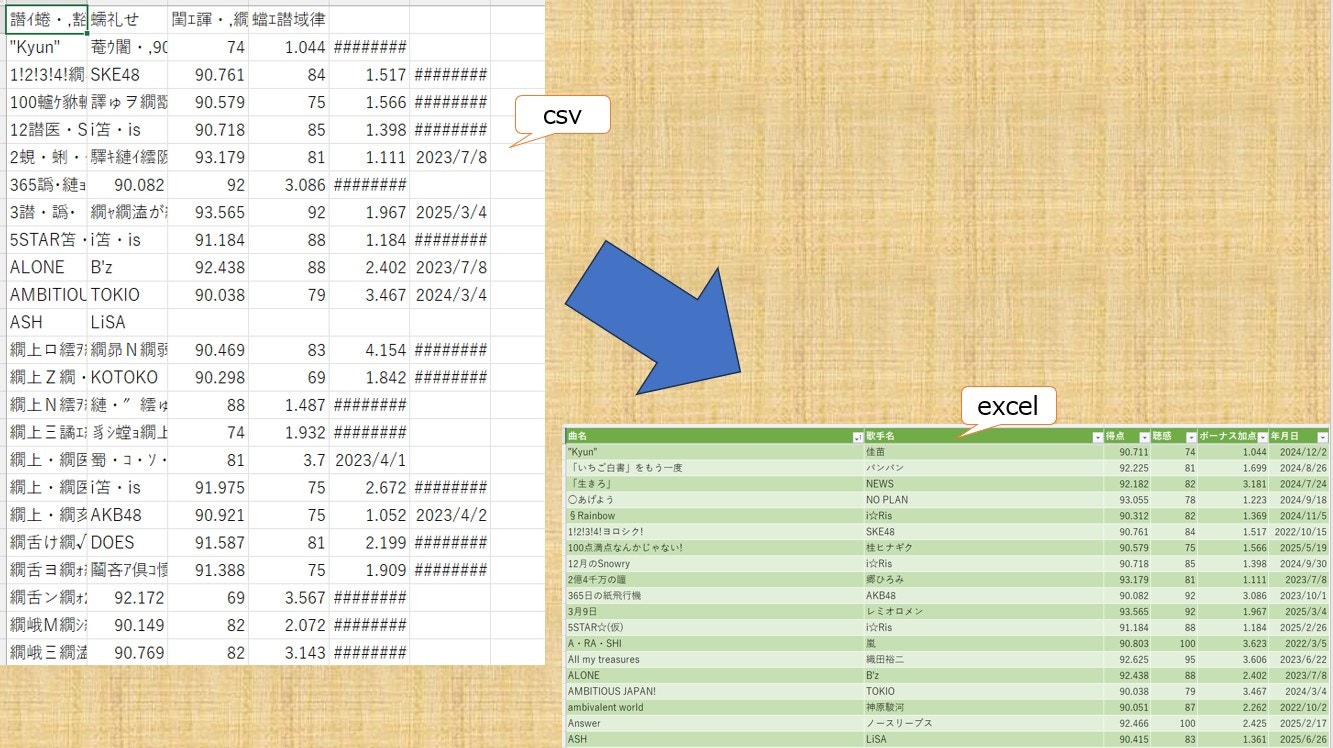 データを見てみると、いくつか過誤データ(漢字違い、数字違い、脱字)はありましたが、660曲のデータに対し、ミスは15~20個程度。ビックデータに使おうと思うと不安に感じますが、趣味に使う程度であれば失敗率3%は頼もしい友人と言えるでしょう。