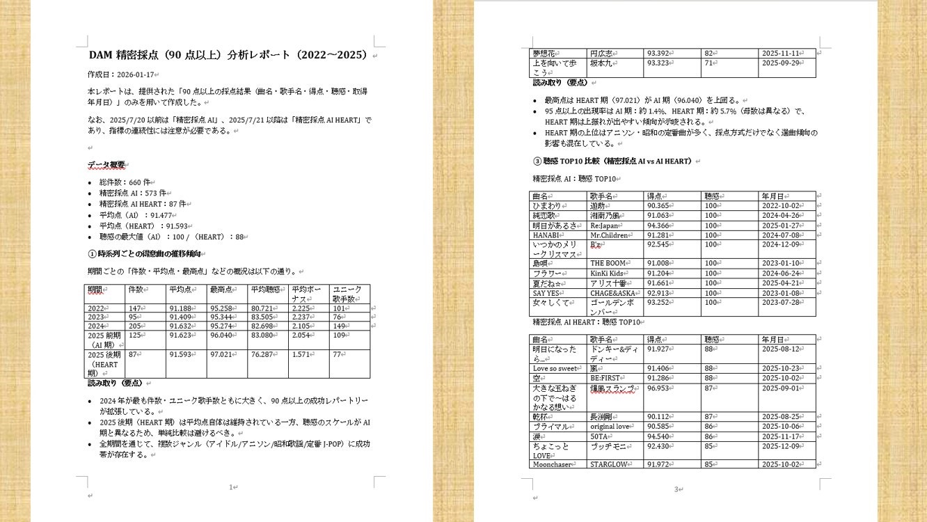 こちらのデータは、私が2022~2025年の4年間でDAMの精密採点で、90点以上を獲得した曲のリストです。 ただし、取得年月日が2025/7/20以前は精密採点AI、2025/7/21以降は精密採点AI HEARTでの採点のため、同一指標のデータとはなっていません。