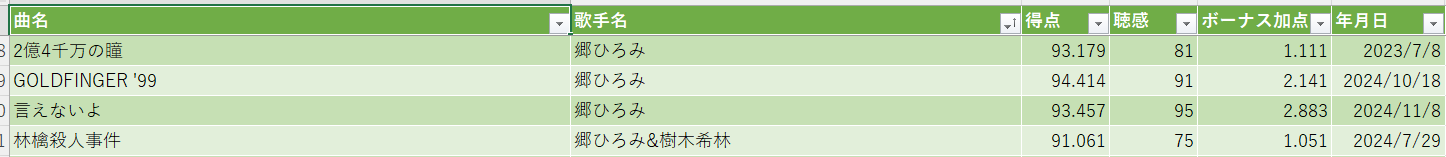 こういうのを、一律"郷ひろみ"と評価してほしい、とお願いすれば統合したうえで、分析してくれます。同じ歌手名を含むで一律統合してくれだと、時間がかかったり、意図せぬ統合も起こるので、現段階だと、表記ゆれ統合してほしい歌手を個別指定した方が速かったです。
