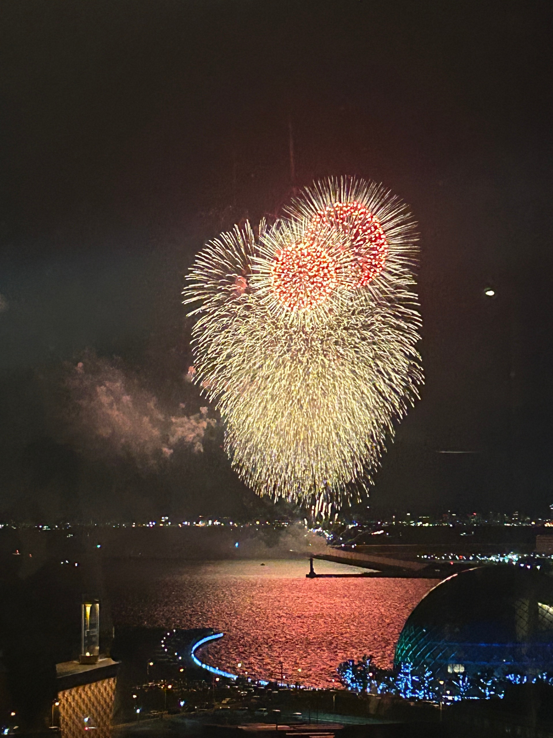 いよいよ最終盤に向かい万博期間中、毎日開催される花火のうち、大規模な打ち上げが行われる最終日となり、間近で拝見できました。ある意味、会場よりもレアなアングルとなりました。