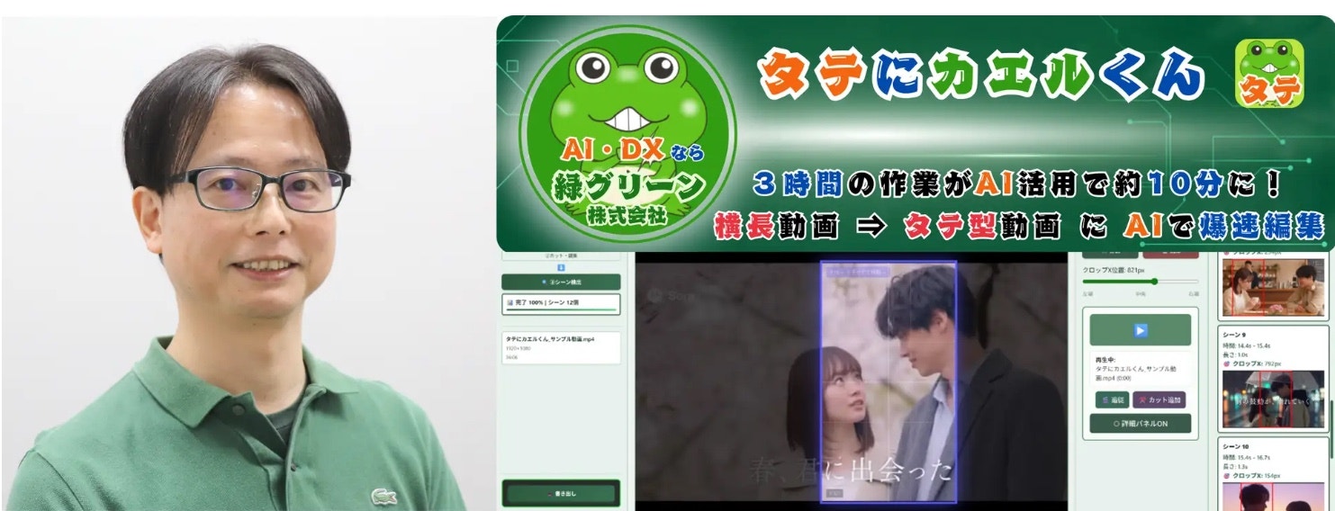 テレビ局で29年、技術開発から運用まで現場を動かしてきた経験と、趣味と言えるほど没頭しているAIの知識で、現場と最新技術をつなぐのが私の強みです。現在テレビ局は、人手不足からSNSへの情報発信が不十分で、発信力低下により地域の魅力が埋もれ、地域経済にも影響しております。そこでSNS向けのタテ型動画AI編集アプリ『タテにカエルくん』で発信力を再強化します。また、大阪の中小企業の挑戦を支えるべく、研修とアプリを一体化した『つカエルAI』を開発。テレビの発信力と中小企業の挑戦を加速させます!