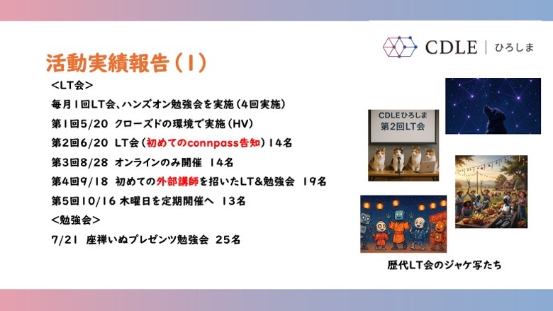 CDLEひろしまは毎月LT会、勉強会を開催しております。