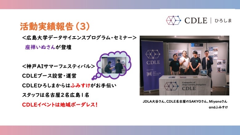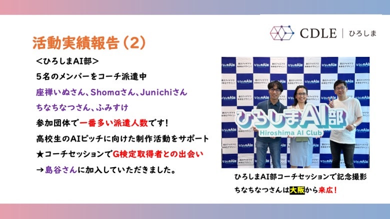 CDLEひろしまはひろしまAI部 の活動の中で5名のコーチ派遣を行なっています。