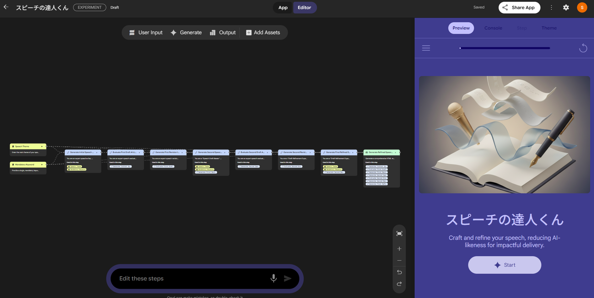 そこで、"添削案に基づいてスピーチを修正"といった方式をやめて、"添削案の直後に、メインテーマと必須キーワードを再取得して、メインテーマ・必須キーワード・添削案の3つを制約にスピーチを再生成する"という手法に変更しました。 こちらに変更したことで、添削が進むごとに個性が増やすことに成功しました。