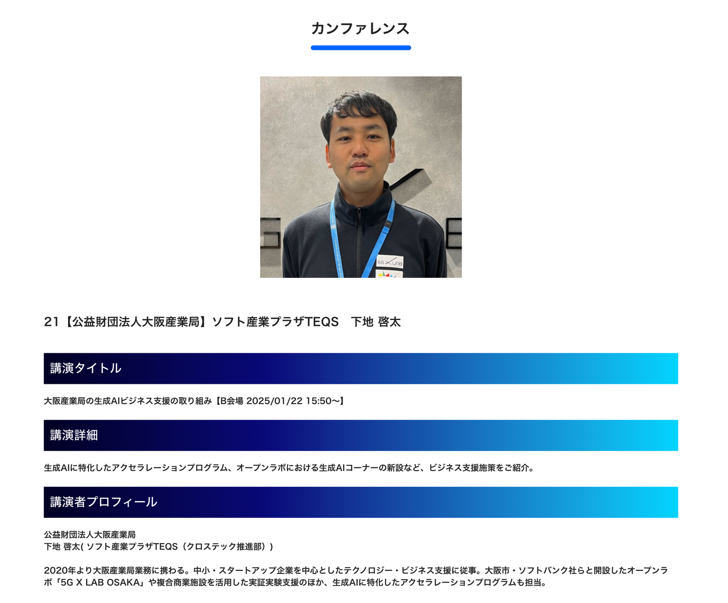 また、大阪産業局ソフト産業プラザTEQS様は5G X Labのブースを開設されます。こちらに生成AIコーナーが新設され、CDLE大阪メンバーのプロダクトも常設展示されており、皆様にご希望いただければ来場のセッティング可能です。