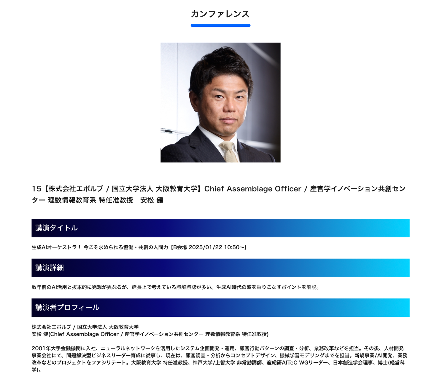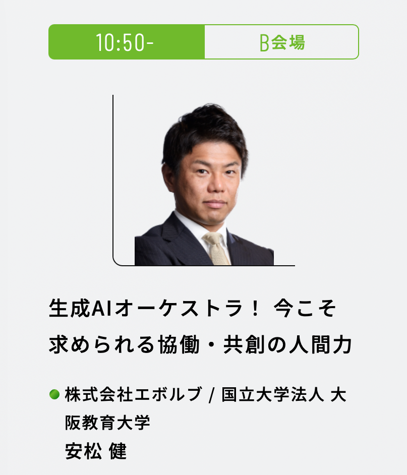 安松さんは教育現場への生成AIの活用戦略については日本のトップリーダーと言える存在です。先日には大阪教育大学 天王寺キャンパス みらい教育共創館にて「生成AI活用最前線 教育界とビジネス界の交差点」を教えていただきました。