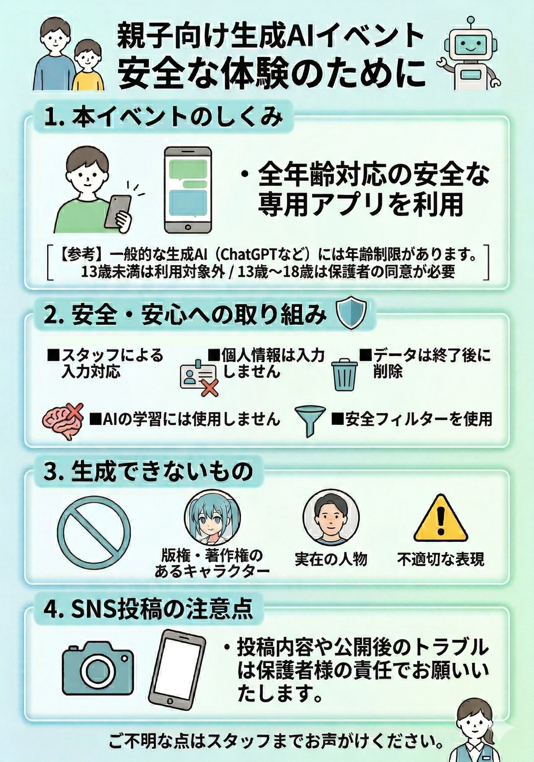 最近は、子どもの生成AIの利用に関する安全性について慎重に扱われるようになっており、特に安全面に配慮するため、下記のような説明資料を用いて、参加前に親御さんへ事前説明を行いました。少しでもAIを安全に使うための学びにつながれば嬉しいと思います。