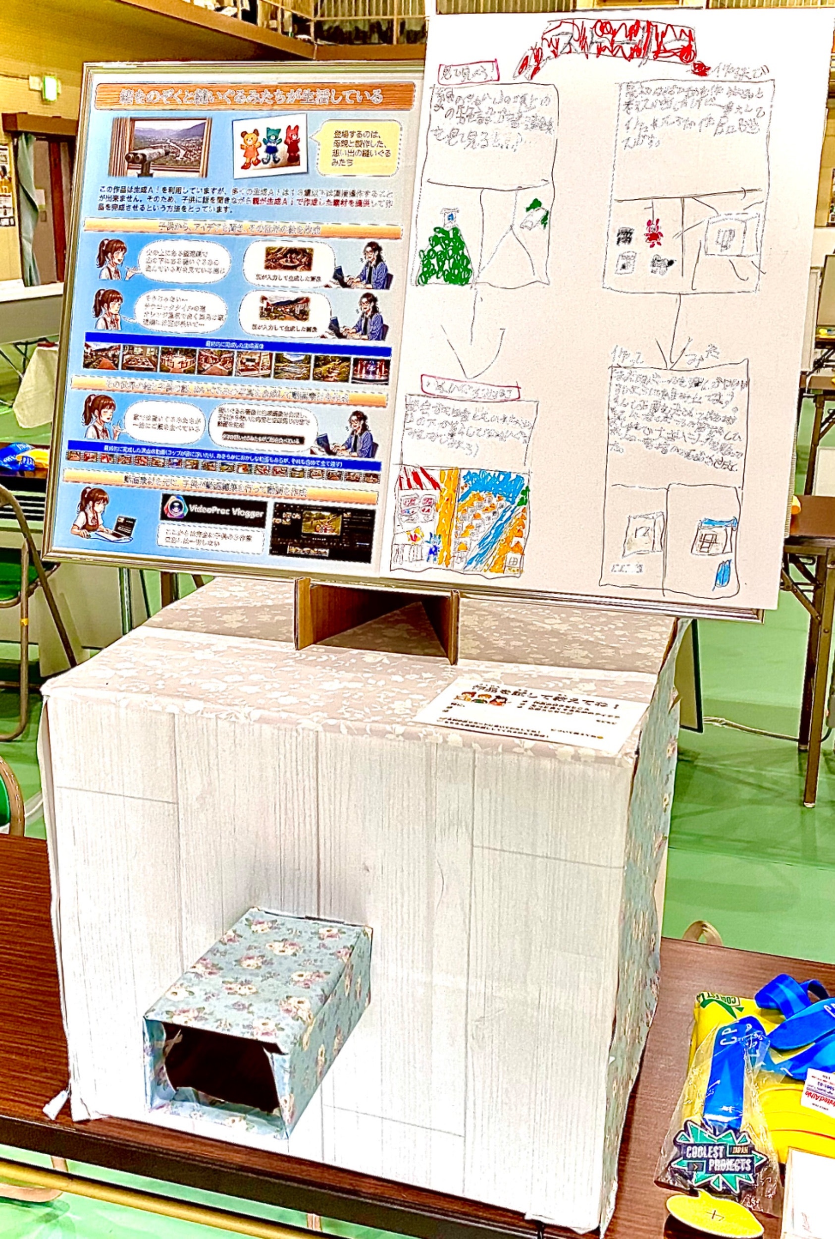 私の下の娘も「箱をのぞくと縫いぐるみたちが生活している」という作品を応募し、展示しました。